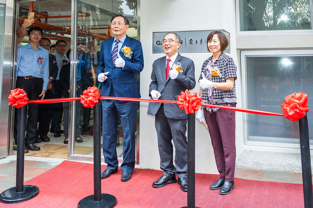 Garmin董事長暨創辦人高民環(圖左)、夫人趙郁芬女士(圖右)及臺大校長陳文章(圖中),在「臺大‧Garmin教師宿舍」落成典禮上剪綵。