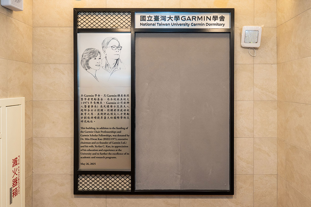 「臺大‧Garmin教師宿舍」內佈告欄設置高民環伉儷銀色雷雕素描銘牌,傳遞高氏家族對母校臺大的深厚關懷與支持。
