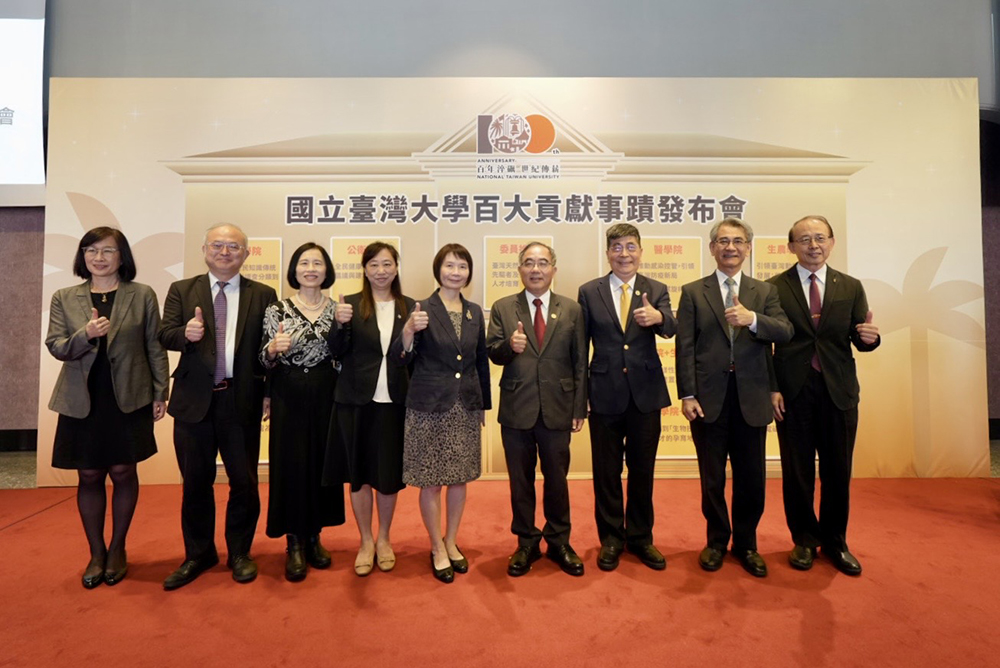 臺大於11月7日舉辦第二屆的「百大貢獻事蹟發布會」,繼去年首屆公布的24件後,校長陳文章偕同多位學院院長公布並說明今年選出的15件百大貢獻事蹟。分別是:「臺灣原住民知識傳統的確立–從調查分類到夥伴關係」、「全民健康保險制度的倡議與建制」、「引領臺灣動物科技發展:奠基經濟動物產業現代化」、「維護臺灣生物多樣性–國家公園、保護區及物種保育體制建置與推展」、「從『釀造學講座』到『生物技術開發中心』–生物科技與人才的孕育地」、「化工製程與粉粒體技術的開創與應用」、「長年推動災防科技,培育防救災重建人才,與建立國際級災害防治靱性」、「引領臺灣活動構造與地震地質研究的關鍵力量與全球影響力」、「推動感染控管,引領臺灣防疫新局」、「治療幽門螺旋桿菌以預防胃癌」、「全球首套中文語音辨識系統,推動全球華語語音技術和語音資訊檢索技術的發展」、「變分電磁學先驅研究」、「創建臺灣民主動態研究,對亞洲民主化研究具有重大貢獻」、「倡議臺灣本土社會人文研究並建立以臺灣為主體之研究領域」、「臺灣天然物化學先驅者及有機化學人才培育」。這些貢獻事蹟未來將集結成冊,編成「百歲榮光」系列書籍,成為紀錄臺大百年榮光的重要歷史文獻。