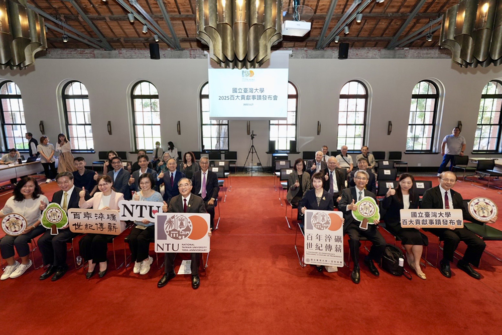 臺灣大學今日舉辦第二屆百大貢獻事蹟發布會,今年共選出15項造福社會的事蹟。圖為與會者大合照。