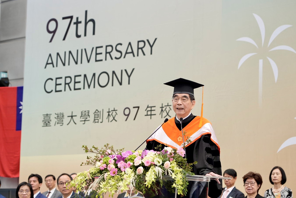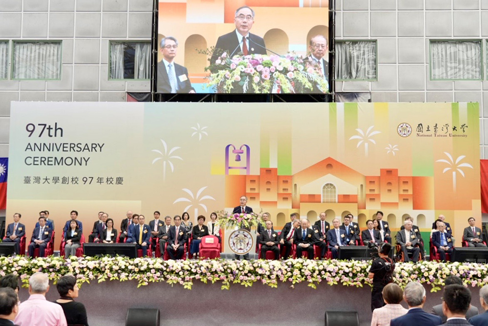 臺灣大學2025年11月15日於校總區綜合體育館舉行創校97年校慶慶祝大會,校長陳文章致詞。